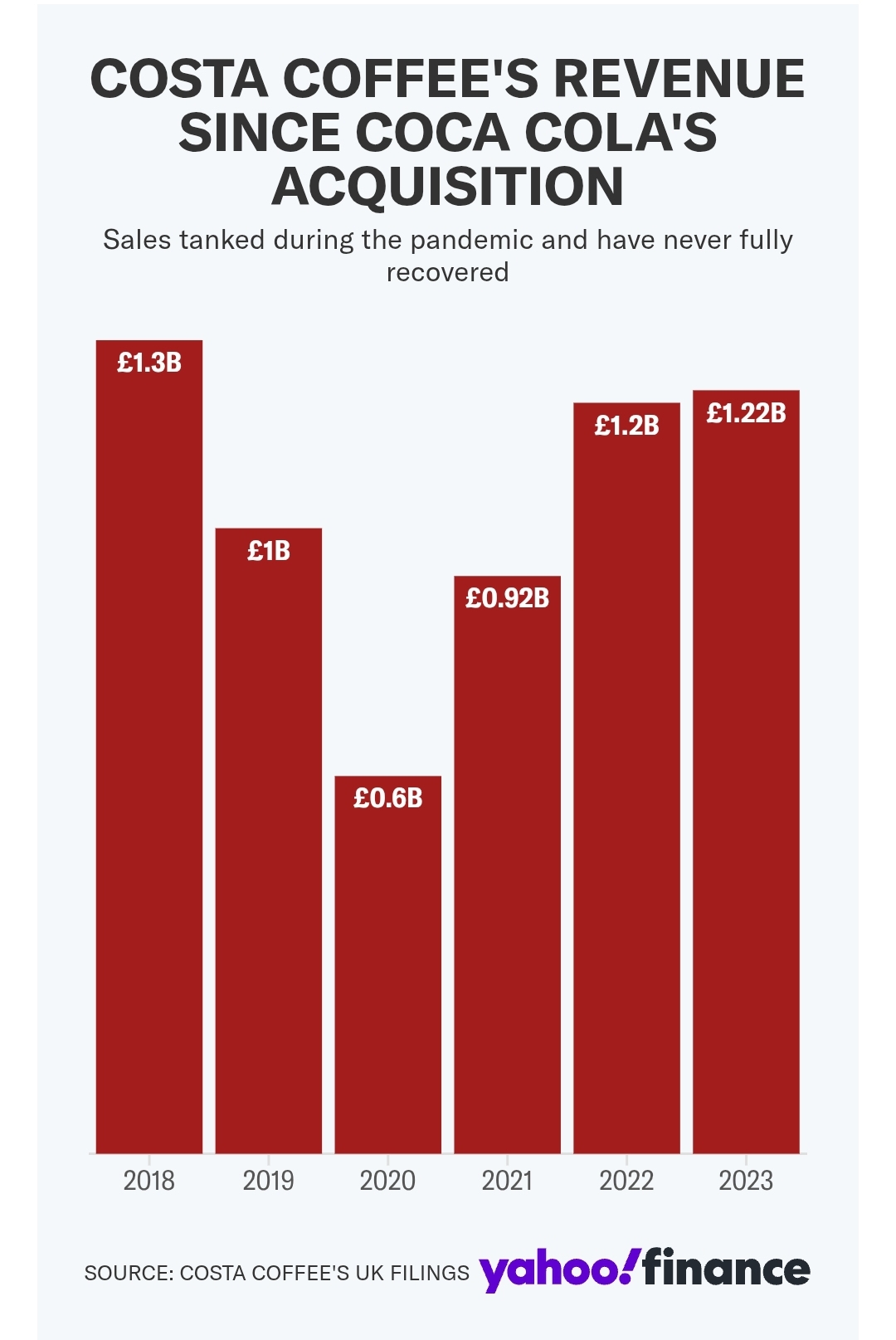 코스타는 2018 회계연도에 13억 파운드(당시 17억 달러)의 매출을 올렸지만 2023 회계연도에는 12억 2천만 파운드의 매출을 기록했다."코스타는 라떼와 카푸치노 같은 제품으로 영국에서 좋은 성과를 거두었지만 미국에서는 그렇지 않습니다. 너무 경쟁이 치열한 시장이기 때문에 더 큰 압박을 가할 수는 있지만, 가장 저렴한 시장은 아닐 것입니다. 경쟁이 너무 치열합니다."라고 로스차일드 앤 코 레드번의 애널리스트 찰리 힉스는 말한다.