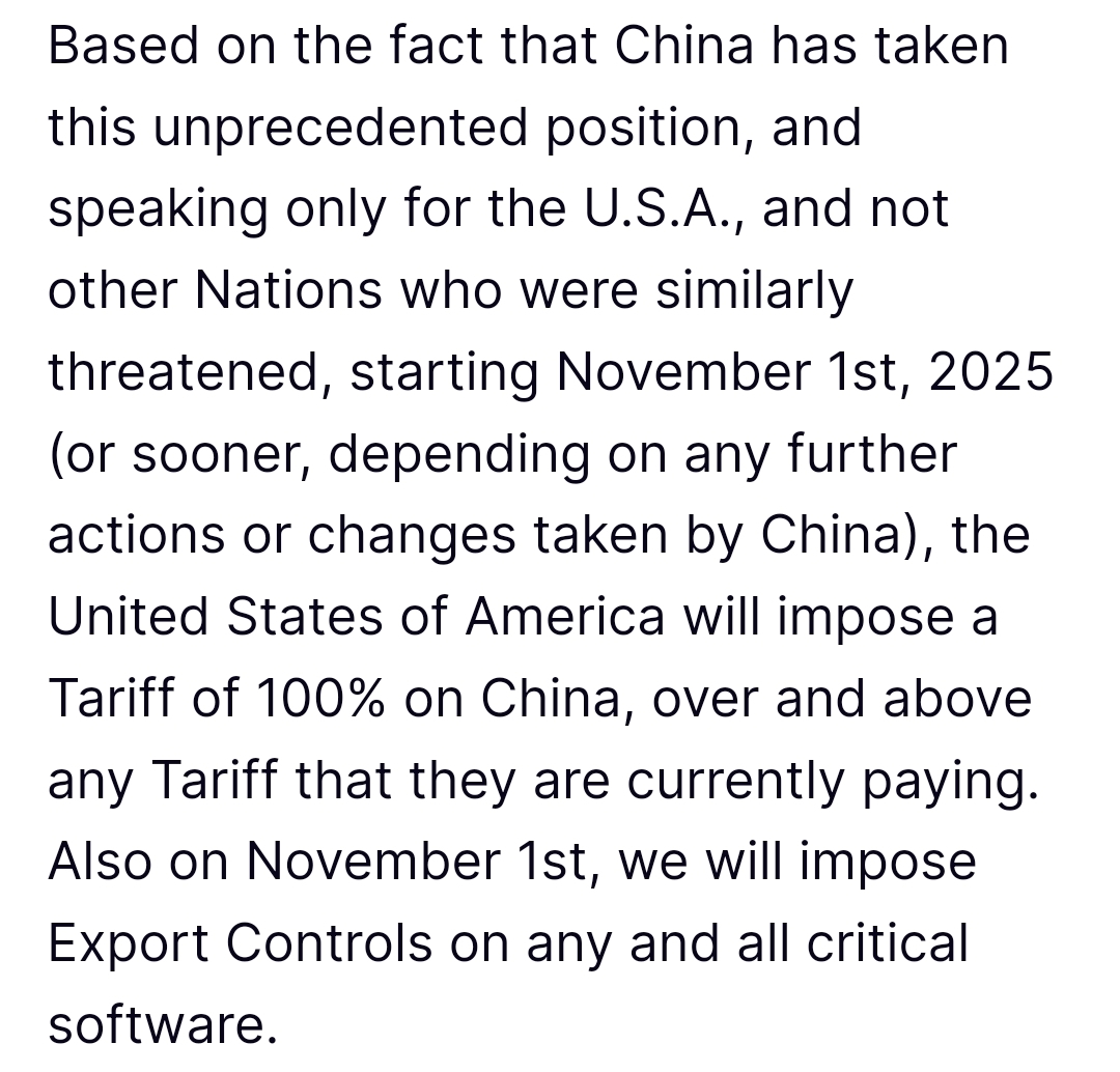 중국이 전례 없는 입장을 취하고 있으며, 유사한 위협을 받은 다른 국가들이 아닌 미국만을 대변하고 있다는 사실에 근거하여, 2025년 11월 1일부터(또는 중국이 취한 추가 조치나 변화에 따라), 미국은 현재 중국이 지불하고 있는 모든 관세를 초과하여 100%의 관세를 부과할 것입니다. 또한, 11월 1일에는 모든 중요한 소프트웨어에 대해 수출 통제를 부과할 것입니다.